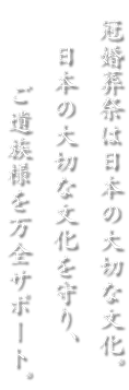 弊社では冠婚葬祭の仕事に携わるうえで一番大切なことは、 常にご遺族様の立場に立つことと考えております。 葬儀は突然なことですので、 落ち着かない日々を送られていることと思います。 ご葬儀当日のお返し物から、四十九日の御香典返し、 御仏壇、御位牌まで一貫してご遺族様をバックアップし、 少しでも心のご負担を軽くしていただければと心がけております。 だからこそ取り扱う品物は私共自身が納得した品物しか取り扱いをせず、 皆様にご満足いただける品物をご提案致しております。