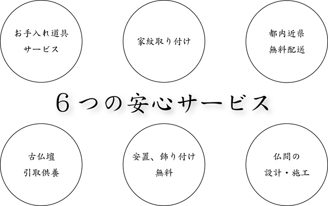 購入後の設置や飾り付けのお手伝い、不要になった御仏壇の供養までサポートさせていただきます。 お客様の不安や疑問を解消し、安心してお買い上げいただけるようサービスに力を入れております。
